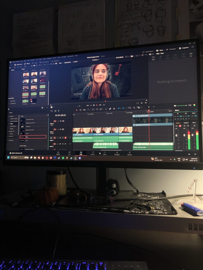 The editing started with Mark editing and putting together about four of the scenes we filmed that day in class which was to show be what he was thinking about how the editing should go. I then took the file home and begun putting everything in and seeing what needed to be done. I muted the original audio as it was to different in sounds and volume fun fact I switched in audio (seen in the edit) with a voice memo of just outside white noise for room tone. After all of them were put together I realized we had to many clips that would go over the time limit so in class, I met with our group showed them a rough copy I produced and discussed what should be dropped to make the time we cut the car scene and the blank wall/green screen scene because they were both not that good quality meaning we would have to redo them so not to add more to our plate we dropped it. After the meeting I went back removed the scenes and begun to move stuff around, drop the mentioned clips and started tweaking the timing of the clips to be just right.