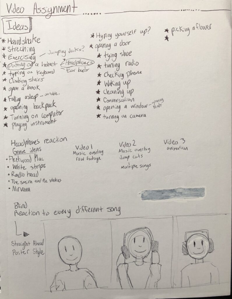 This series of videos was a representational piece on how we react to different types of music. The series of videos each focuses on different aspects of reaction. The gesture was putting on the headphones which each time it was equipped the song would change. The blind gestures/unconscious reactions to the music clips were what was the main focus of these videos. To make sure there was a stark contrast in the initial reactions. We conjured a playlist that had a few horrible to listen to songs as well as songs that Anne herself liked. This created a good contrast in the video and allowed the viewer to easily gauge her reactions. Each video plays a part in a larger whole the first raw video focuses on the reaction, the edited video allows the viewer to now hear some of the audio that was in the first clip giving more context to the reactions and the third video showcased the first gesture/movement which is often the purest reaction because its the reaction that doesn’t have any listening fatigue associated to it.
