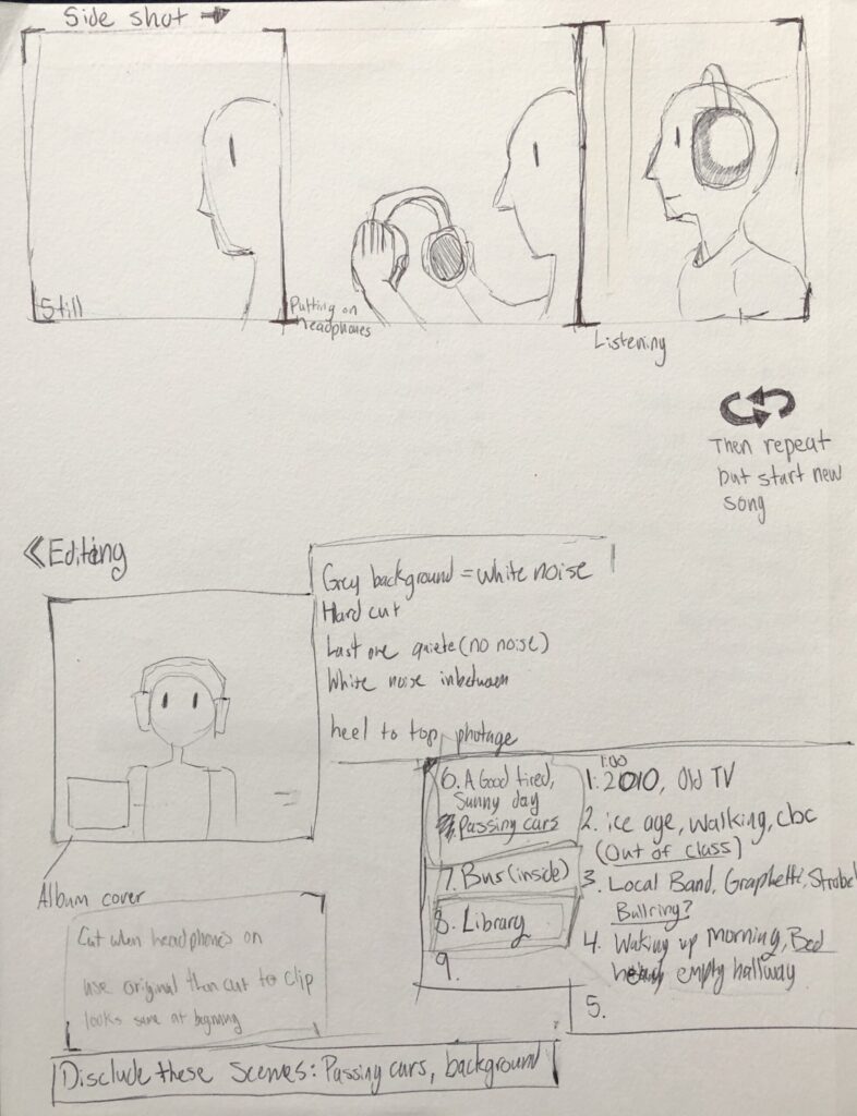 After filming the Raw video which was a one shot in order to show real and authentic reactions from Anne we started filming other scenes in different places to use for editing. We even filmed at different angles but was later scraped because they didn’t allow the shots to transition easy during editing. We filmed a bunch of shots in different areas mostly around school but some we’re in public in order to shown drastic changes in scenery that one reflected the song and clearly showed a change in background. In most shots Anne was given the music to listen to again in order to get her to react again even if its subdued due to her already hearing it once. On the note of the songs a playlist was made from some of Anne’s favourite songs, one of marks and a different selection of songs that attempted to be diverse in musical genres.