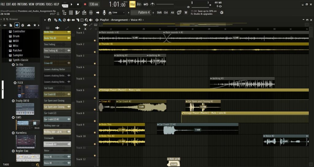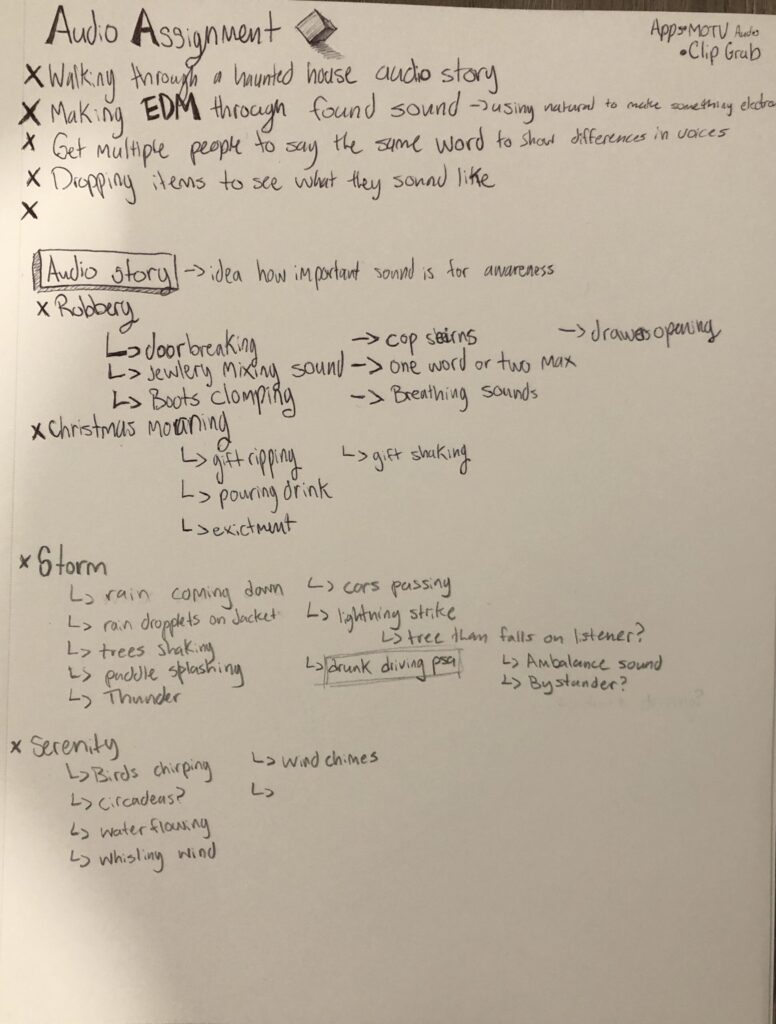 The process was I first wrote down some ideas. My intial idea when I started was going to do a robbery but I realized it may be a little to harsh, so I went with the storm idea after thinking on the ideas for a few days. I was going to go with a storm and a tree falling and hitting the person to show that life can end at any moment and to be happy with what you got, but I pivoted again to a more PSA format. I gathered some sounds that I already had on my phone as I mentioned before I thought about this assignment for a while (this was that I recorded random sounds in nature that I thought might be helpful when the project came by). I recorded some rain sounds in September and found the perfect use for them. the walking was recorded when I went for my morning run, the rain hitting my coat was recorded when it was raining, the rolling on the car sound was recorded by rolling my hand on a car and of course my voice is my voice. There was tons of editing to each the audio clips mostly to make them louder and a phaser was added to get that dream like effect in the end.