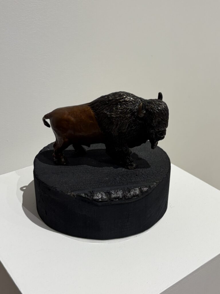 This piece is Out of the Ashes by Adrian Stimson and depicts a story from Waterton Lakes National Park. The Kenow Wildfire devastated the park in 2017, including the paddock where the bison herd was kept. During the evacuation, just one bull was left behind. After the fire, the staff returned and found that one bull was still there. This piece really resonated with me, as it prompted me to think more deeply about survivance. The one bull was not just a symbol of survival after such a disaster. The bull makes a powerful statement that it is still here despite all the destruction, demonstrating renewal and continuity. Still, it also represented endurance, like Indigenous peoples who have continued to adapt and protect their cultures despite the colonial devastation. This taught me about strength throughout devastation and the importance of the power to endure even when you feel lost or stuck. The piece being called Out of Ashes also makes me think that new life often begins after destruction, where the bull could be made out of ashes (destruction) and is a symbol of strength, renewal and endurance. Despite the destruction, you are still who you are, changed but not forgotten.