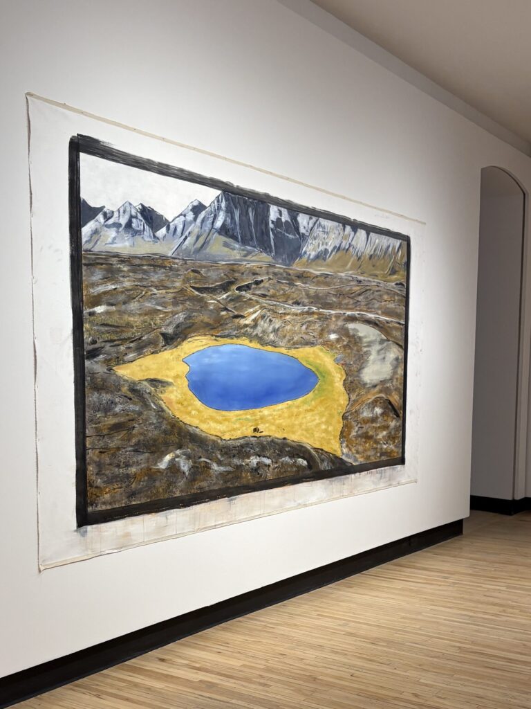Lone Bull is another work made by Adrian Stimson reflecting on the story of the Kenow Wildfire at Waterton Lakes National Park. I found this piece to be very powerful as it is truly remarkable that all of the land surrounding the bull has been completely burned by the fire, except for the small bit of land surrounding the water, where the bull was found completely unharmed by the raging fires surrounding it. It seems as though in the art piece, the lone bull is carrying on just as normal, demonstrating that resilience can be very grounded. It makes me think that the land and water worked together to protect the bull. I think that the bull in this piece depicts how Indigenous Peoples have continued their way of life, language and traditions even after vast loss. The bull’s calm nature after the fire taught me that resiliance can be quiet, and it doesn’t always look like fighting. I also thought about the importance of continuing to be true to yourself, even when everything around you has drastically changed.