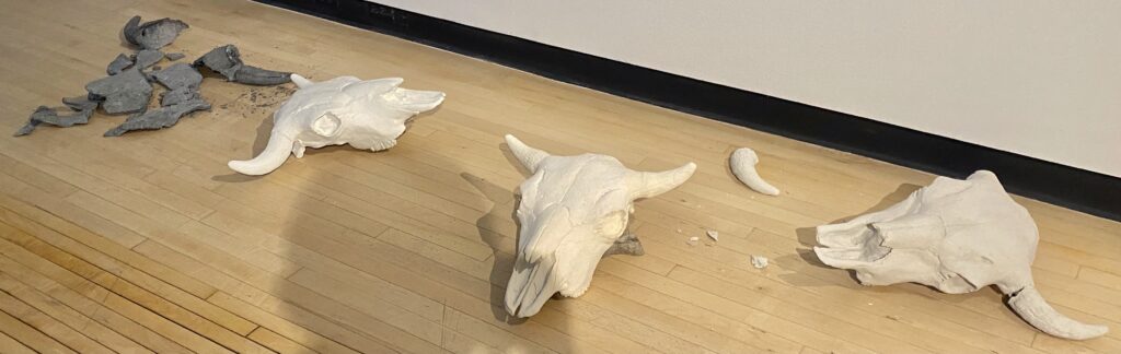 The first piece I’m discussing is “returning the bones (52 days),” a time-lapse video of the dissolving bison skull sculpture made of unfired local clay mixed with seeds. They made a sculpture that would release medicines and plants into the local wildlife, the piece giving back to its surroundings. I bet it’s heavily influenced by animal decomposition, temporarily enriching the soil and making it more fertile for plant life. It’s like a cycle; animals rely on the land they live on for food, water, and shelter, and after they die, they give back to the earth that once sustained them. I learned that Nault chose specific seeds for their sculpture based on the location it was at, ensuring they were native to the area, since non-native plants can become invasive and outcompete local species. Overall, this work encourages us to consider our own impact on the environment, especially as artists.