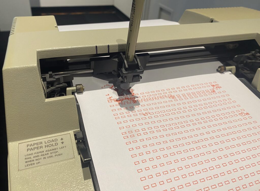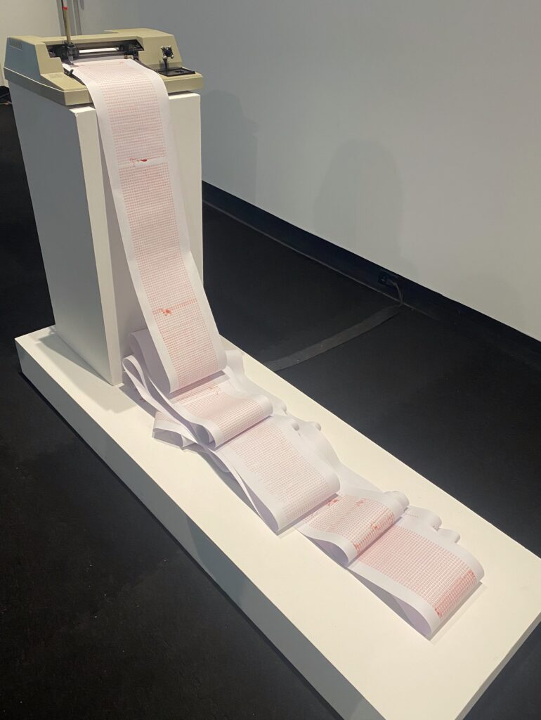 ICFWYWM is a printer-like machine that is tasked with drawing tiny perfect squares repeatedly, but when the machine is observed, it becomes “nervous” and draws imperfect squares. When my friend Abby and I entered this space in the Gallery, we were very confused about the machine’s purpose. At first, I thought the machine had made a mechanical mistake along the way, noticing only a small section on the long sheet of paper. After learning what the machine actually does, we were both intrigued to approach it again and see for ourselves with this understanding. What I took away from this piece is how relatable it is. As someone with anxiety, it’s hard not to feel like everyone is watching, watching your every move, waiting for you to mess up. Overall, this piece for me displayed how invisible experiences like mental health can be visible and tangible, allowing others to see and feel what it’s like to navigate the pressure of being observed.