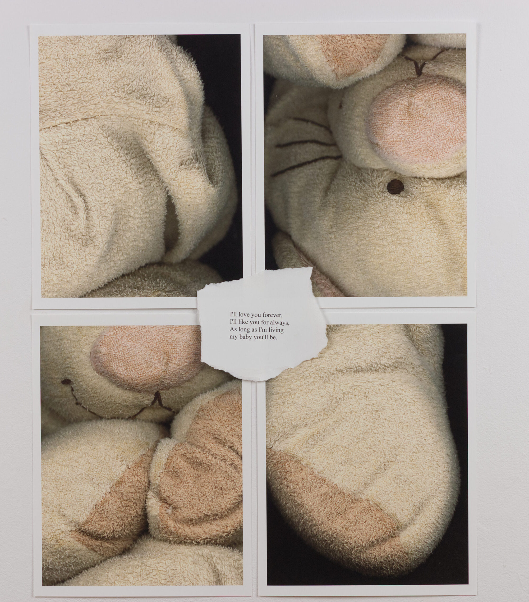 For this piece, I decided to create a conceptual self-portrait for myself. So I scanned my childhood stuffed cat to capture close-up images of every stitch, stain, and worn patch. I wanted to show the physical traces of all the love I’ve poured into this stuffed cat since I was very young. One of my favourite childhood books was called “Love You Forever” by Robert Munsch. Every so often, my Mom would read it to me before bed; it became her way of saying she loved me as I fell asleep with my stuffed cat. I chose to include a quote from the book saying, “I’ll love you forever, I’ll like you for always, as long as I’m living, my baby you’ll be.” to represent the deep and enduring love I have for this stuffy and the memories attached to it.