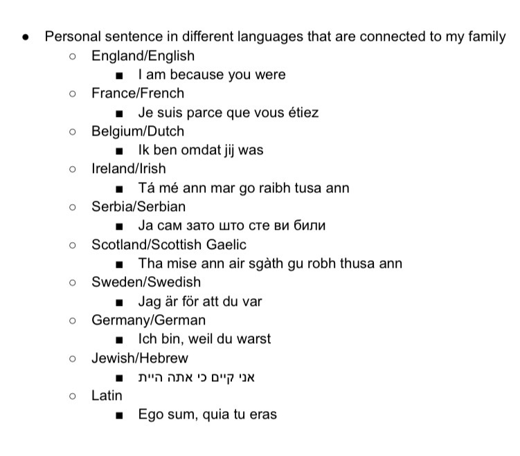 I started by talking to several relatives to put together a list of our family origins. Once I gathered all this info, I had to narrow it down since it covered a lot of places. I focused on the ones closest to me generationally, and sounded the best, and translated the sentence into each language. Some family members who spoke these languages helped record their parts, while I recorded the English version myself. For the other languages, I used an online translation tool.
