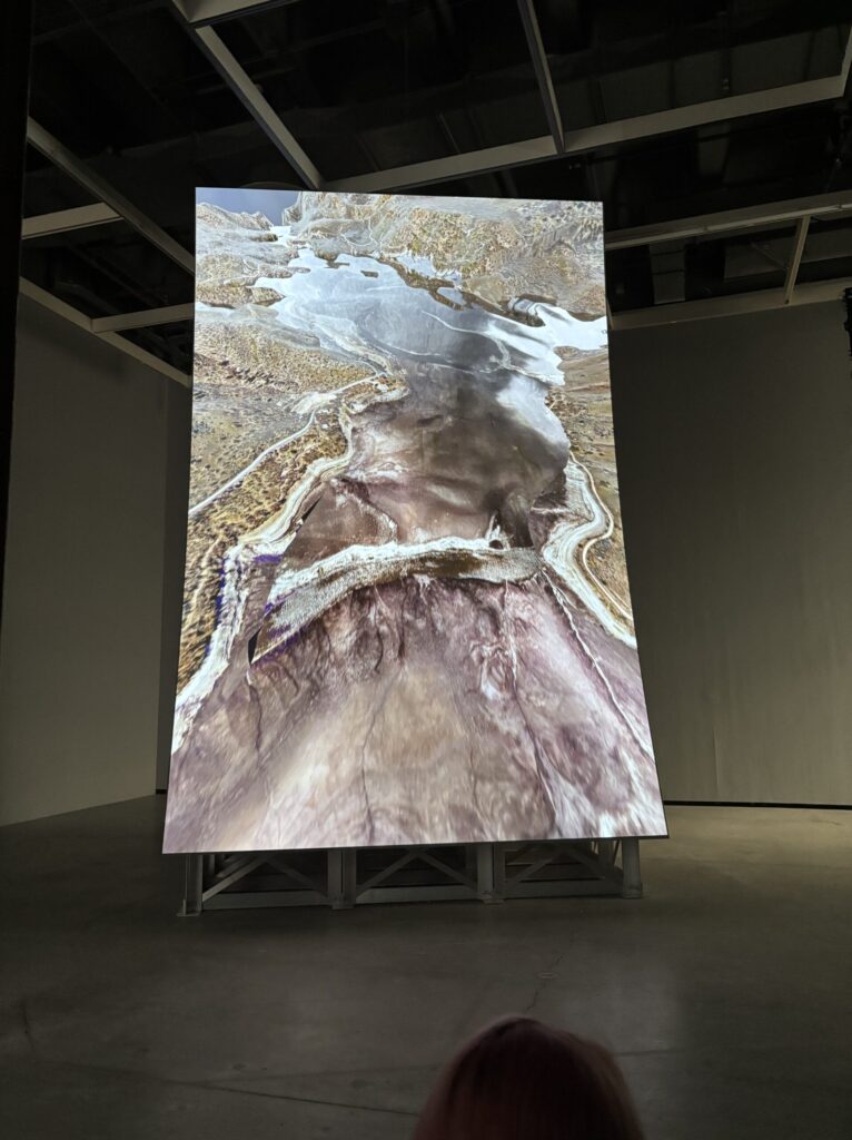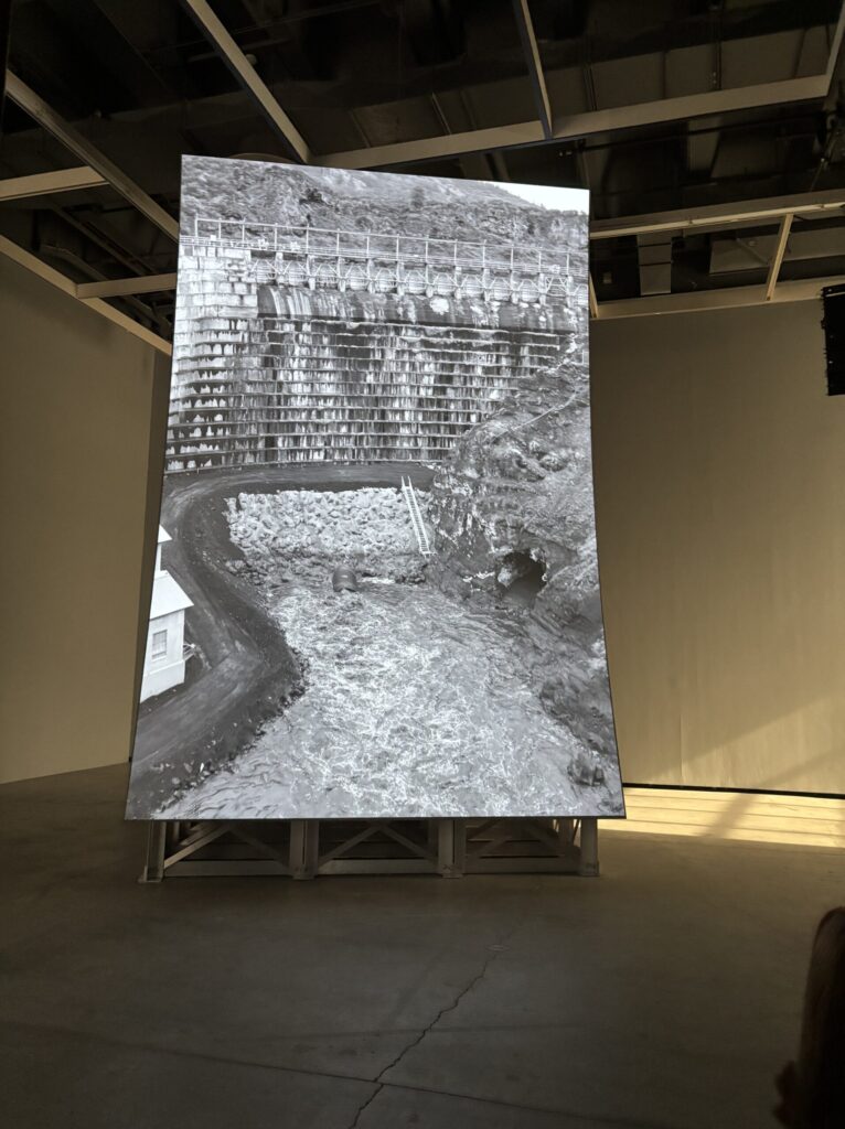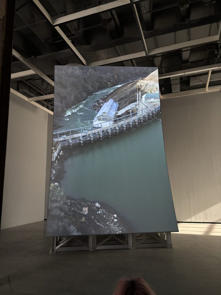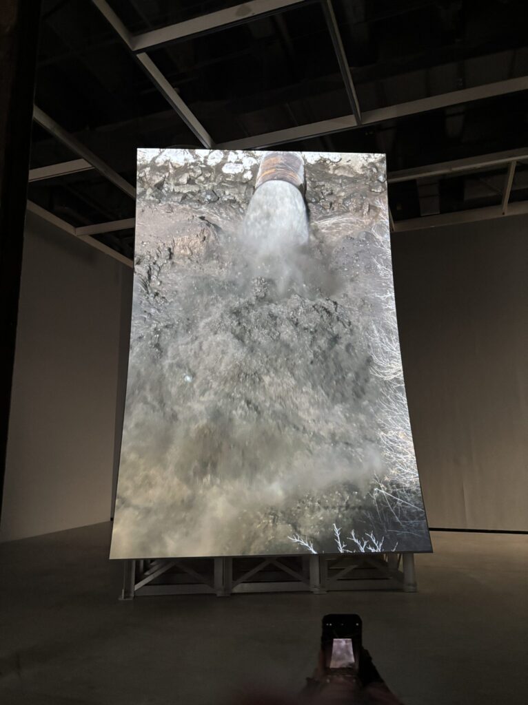 The second work that I thought really stood out to me during the trip was the Murder Bar by Lucy Raven. Here the artist uses aerial and underwater cinematography to record the river flow after being released from a hydroelectric dam along the Klamath River. During the video we get views of sediment being moved around by the water then lifting out of the water again and again. This interests me specifically since I’ve always had a fascination with the environment and especially water related stuff. What I learned from this is that video art can be really impactful.