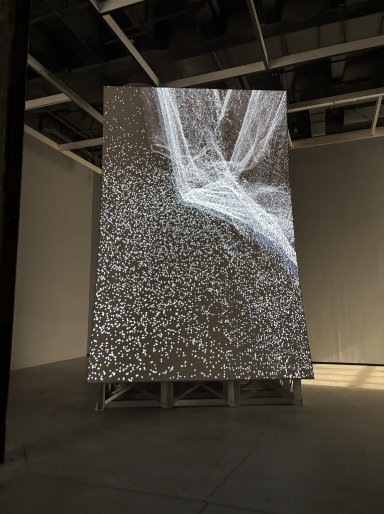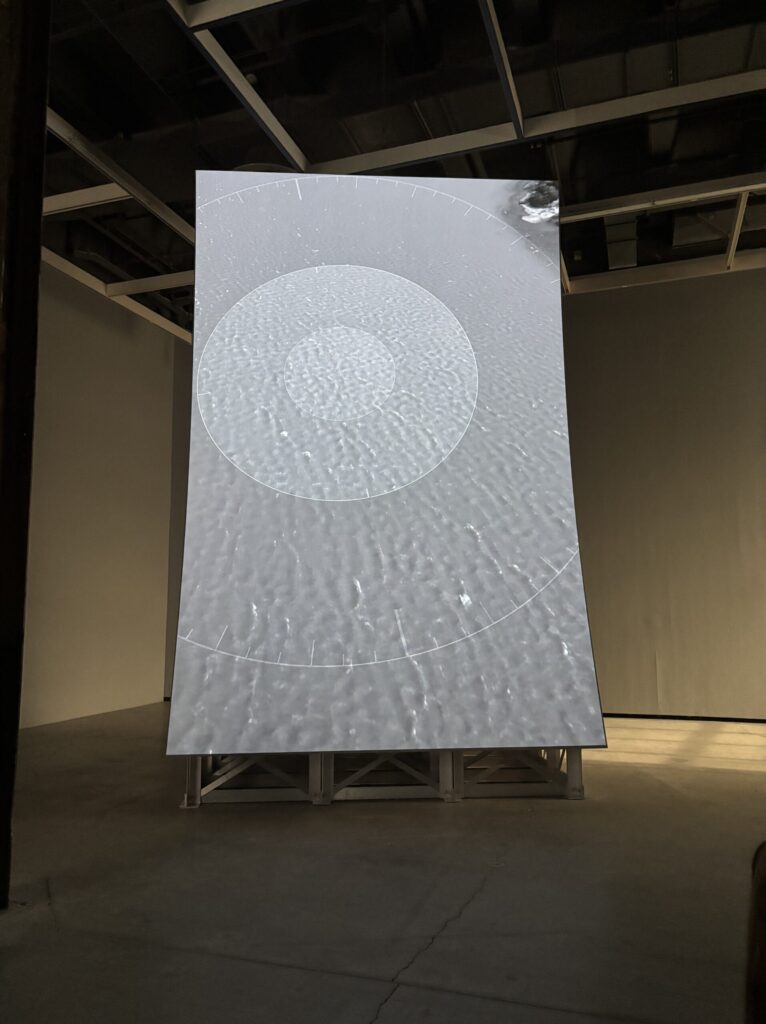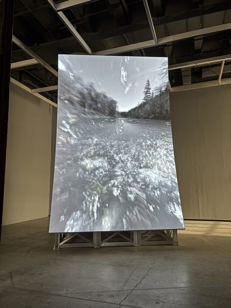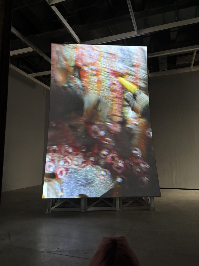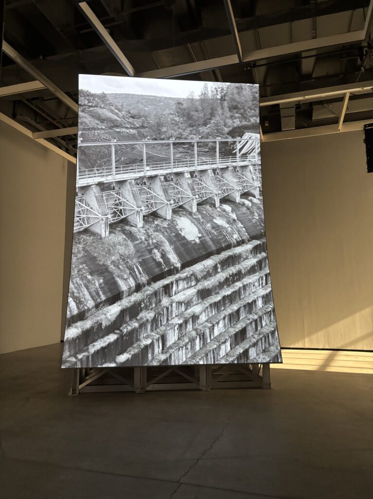The second work that I thought really stood out to me during the trip was the Murder Bar by Lucy Raven. Here the artist uses aerial and underwater cinematography to record the river flow after being released from a hydroelectric dam along the Klamath River. During the video we get views of sediment being moved around by the water then lifting out of the water again and again. This interests me specifically since I’ve always had a fascination with the environment and especially water related stuff. What I learned from this is that video art can be really impactful.