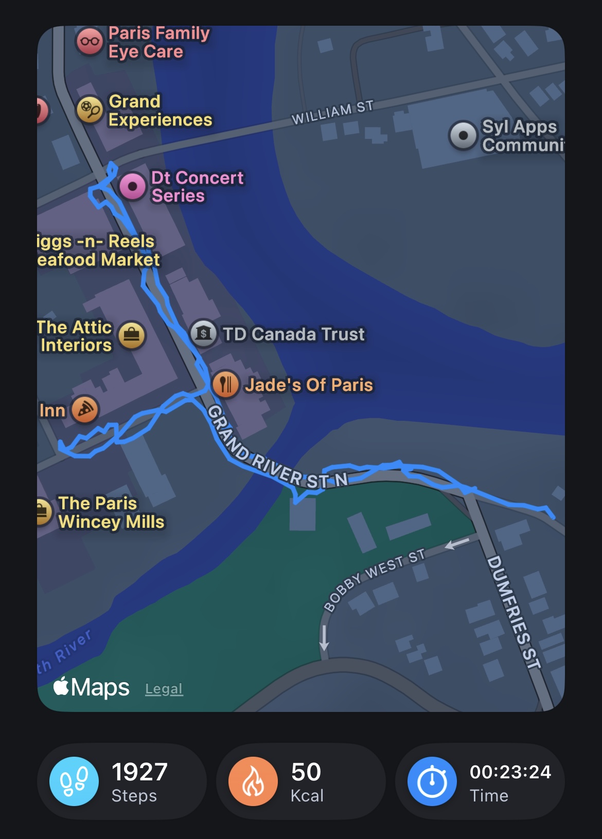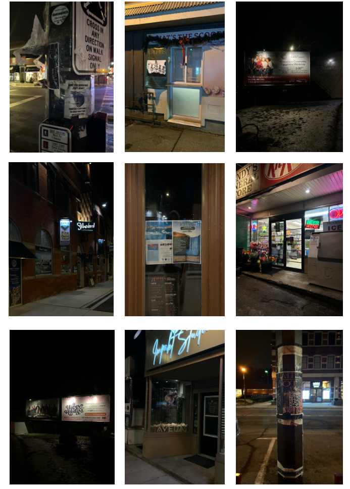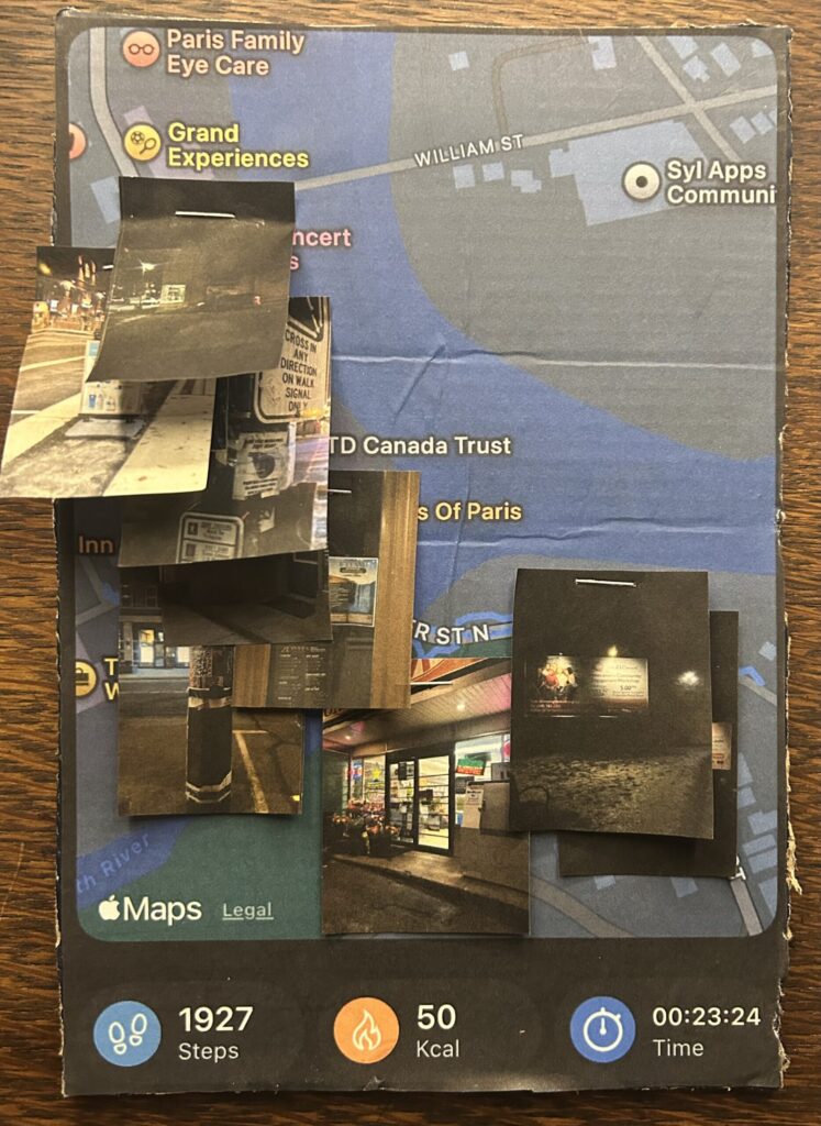 I used a pedometer app to measure the precise kilometre I walked and displayed the advertisements posted alongside. I decided to walk through the town I grew up in, it yielded a lot more results than a section of Cambridge & Hamilton I did because more stores were condensed in a smaller area.