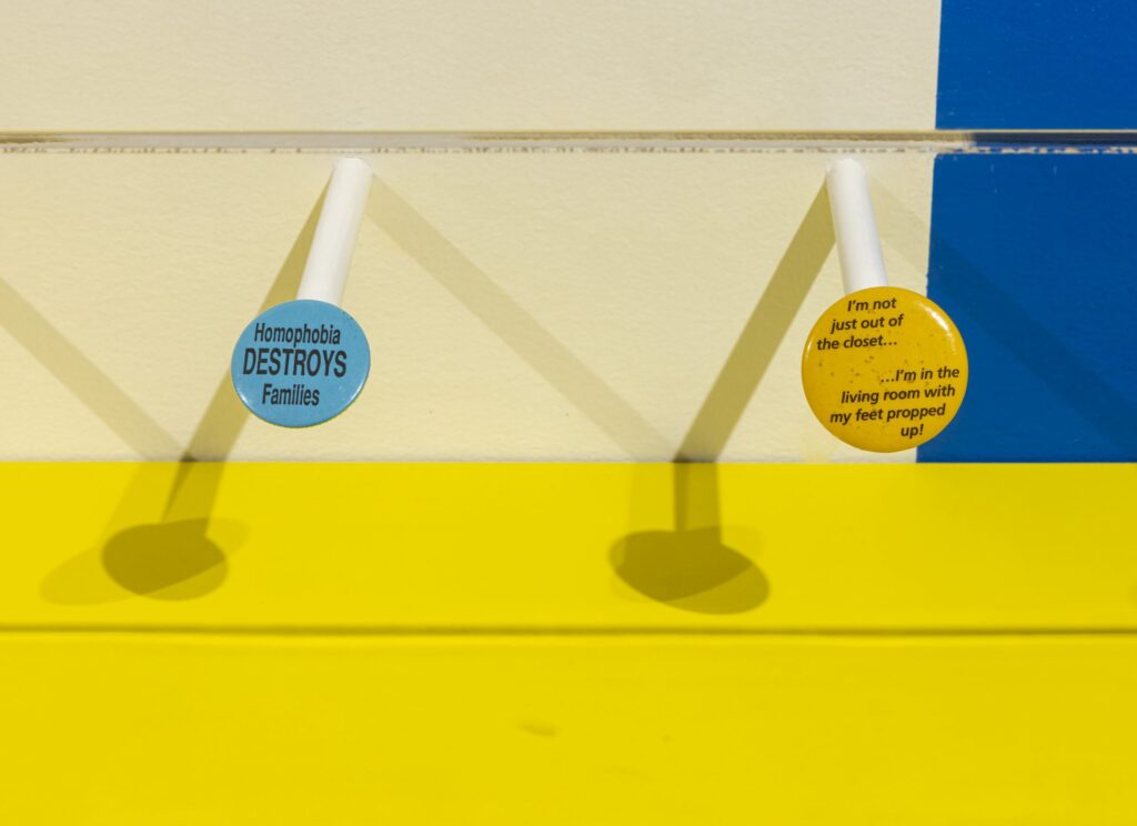 Another aspect of this show that really impacted how I view artwork and my own practice is the buttons displayed throughout. I have made pieces in reference to protest before, but I really enjoyed the presence of functional works. I also really appreciate the comedy that is incorporated within many of these buttons, especially one that says “I’m not out of the closet… I’m in the living room with my feet propped up”. This feels very similar to the type of jokes I tend to make in relation to my own personal experience and trauma, highlighting a way that many queer people cope with the social difficulties that come with being queer.