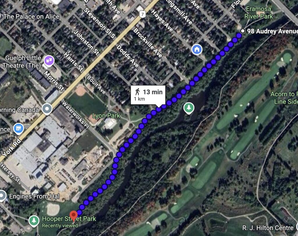 I live near the Eramosa River Trail, a foot/bike path that runs along the Eramosa River between Victoria Road Park and the Gosling Bridge. I used Google Maps to map out exactly a kilometre of the trail from the end of my street to a nearby park.