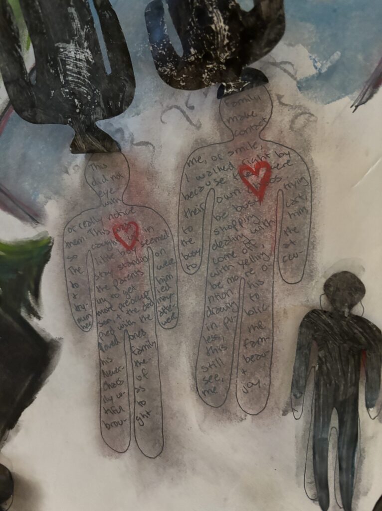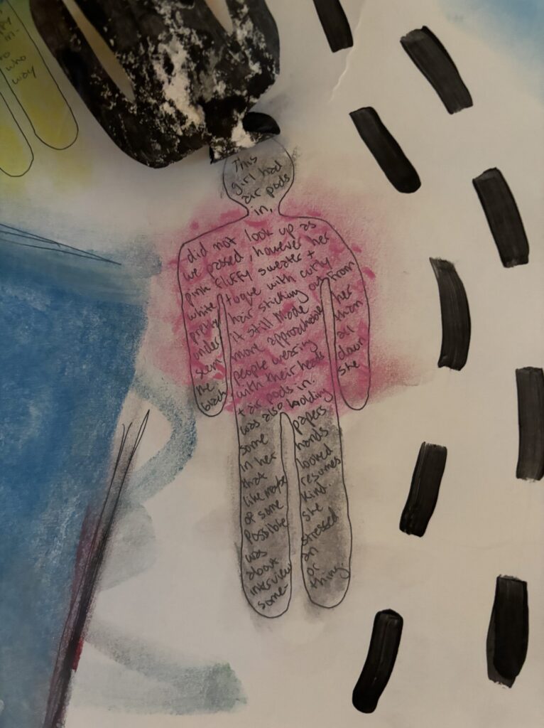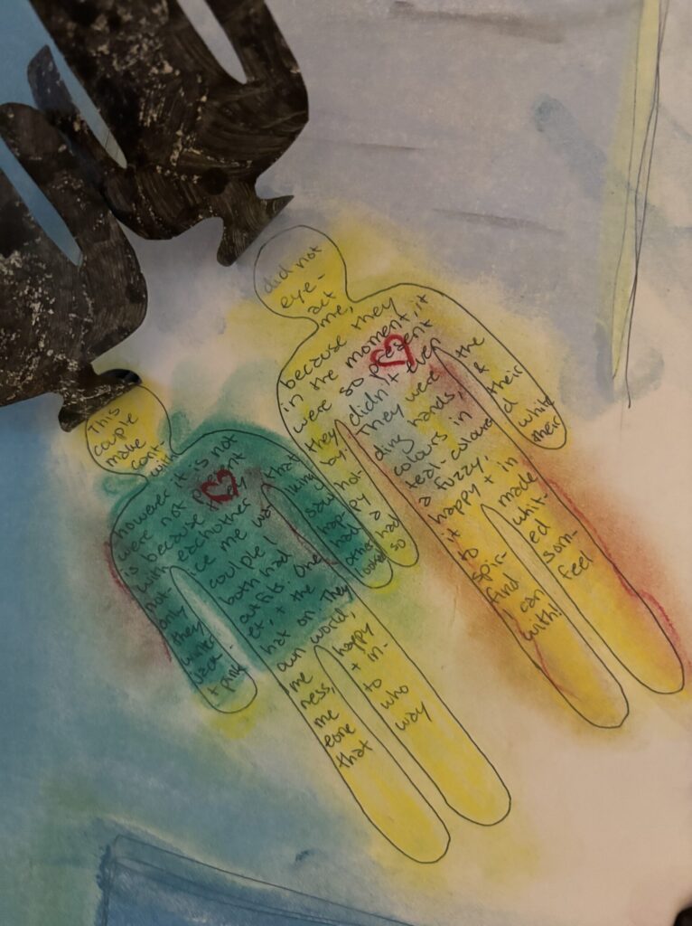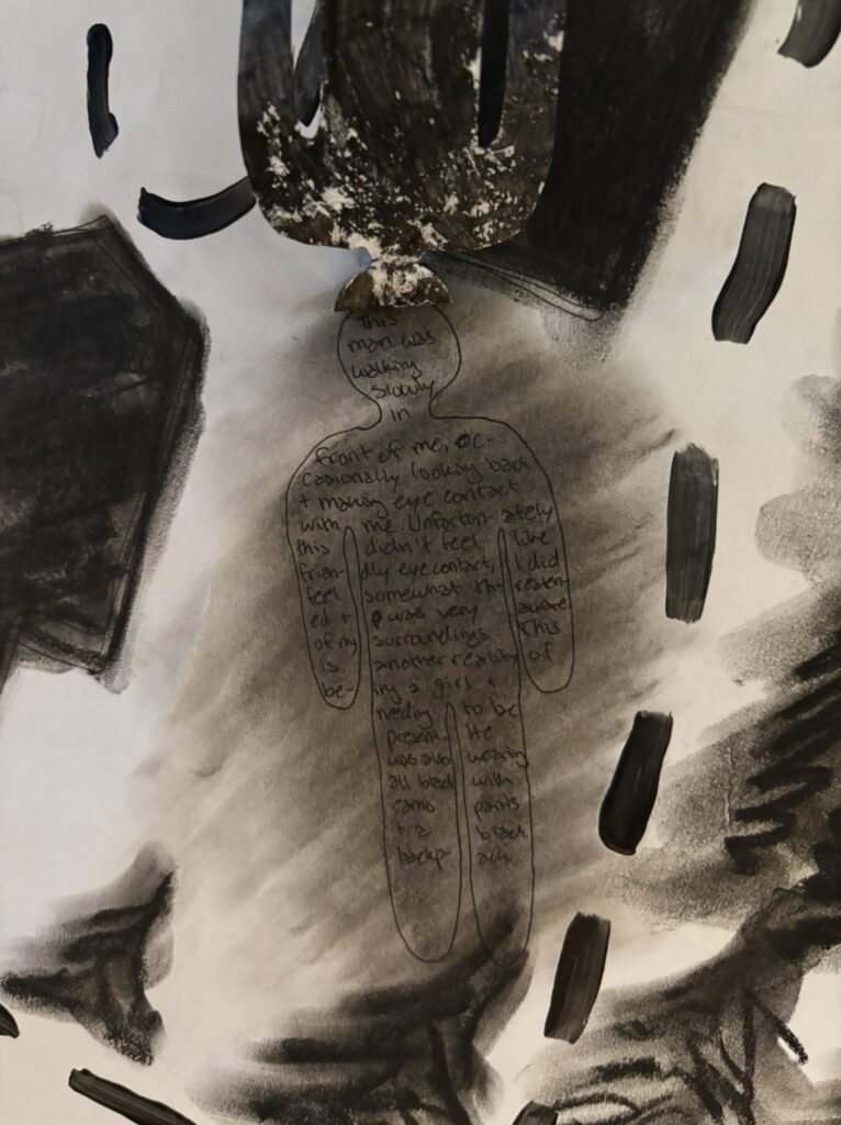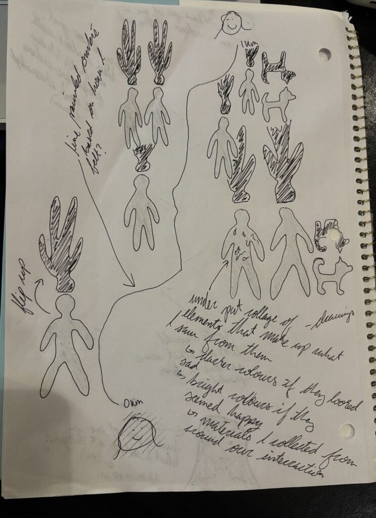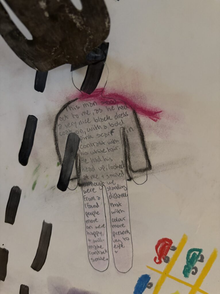 I chose to use chalk pastels for my final work for several reasons. I loved that chalk pastels are supposed to spread, just like they way we appear in public rubs off on other people without us noticing. The flaps I made to show the people I ran into are black silhouettes to represent the fact that without looking up and intentionally noticing, people are nothing but faceless, lifeless, “NPC’s” around us, but with the smeared pastel colours underneath, what was truly underneath them could shine through, and when you lift up the flap you can read the details about what was really going on based on my observations. I used this concept of smudged “energies” in pastels all over the map, where things would be shown in colour or black and white based on how bright or dark their energy seemed to me, affecting the energy of everything around them.