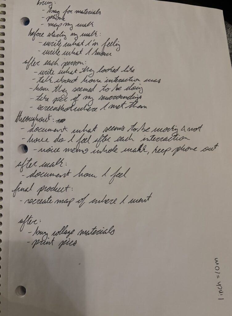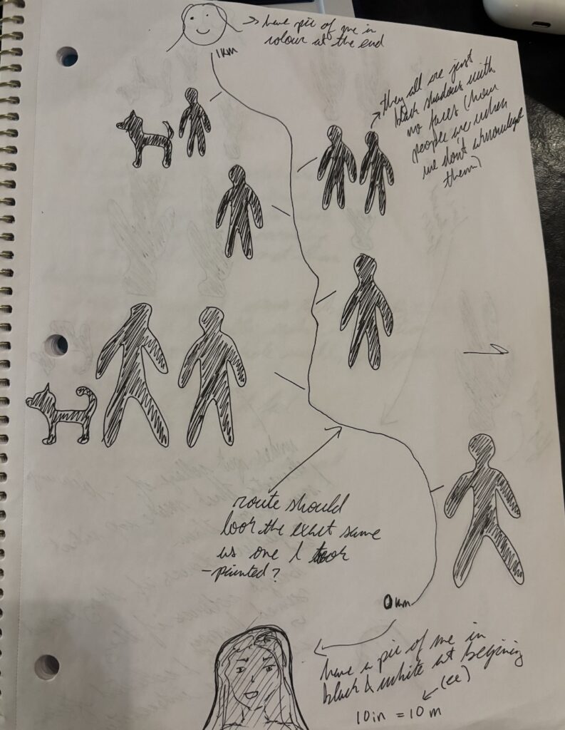 I decided to record voice memos as I walked, sharing my observations of each person who walked by me. I recorded whether they made eye contact with me or not, what colours they were wearing, if they were alone or with other people, did they have air pods in or not, did they seem happy, frustrated, sad, etc. I made a few conclusions with my findings. First of all, people who had colour in their outfits were more likely to make eye contact and smile at me, they also just looked happier in general. The same went with people who were not alone, except for one couple who were barely acknowledging that they were together, let alone noticing that I was there. All of these things of course led me to wonder why they made the choices to wear colour that day, or what was going on in their lives that made them seem happy or sad.
