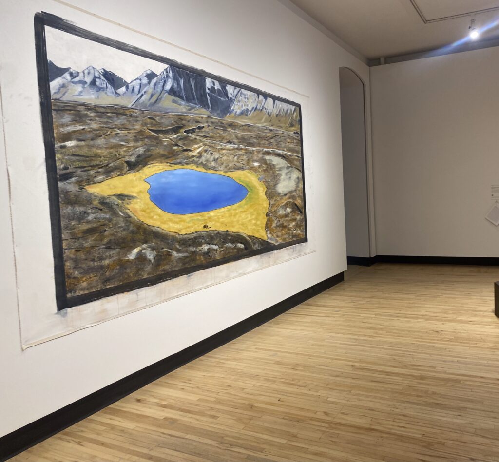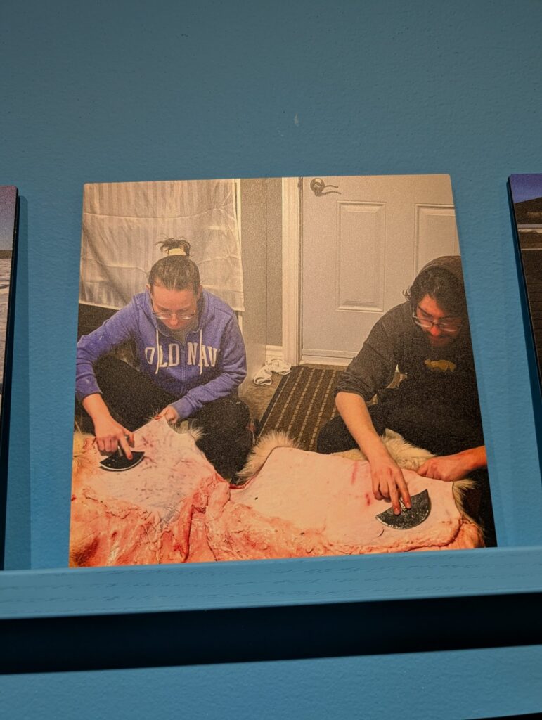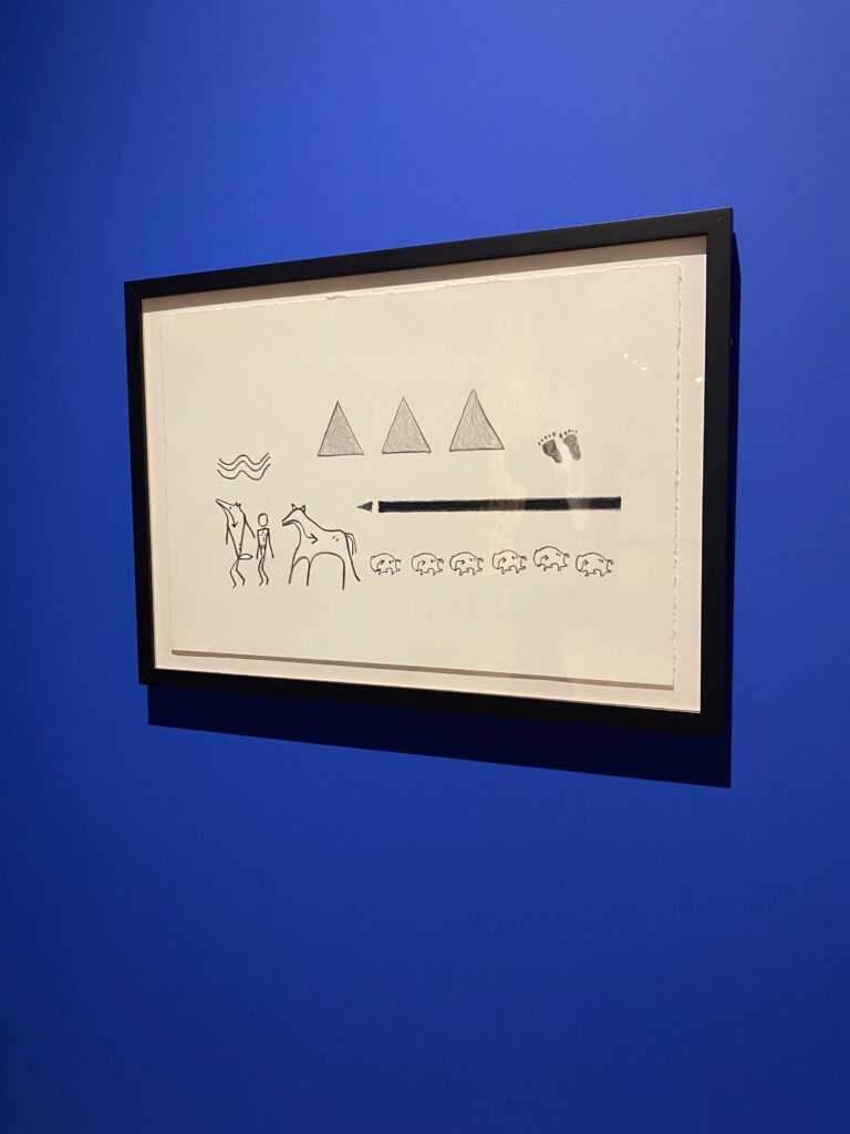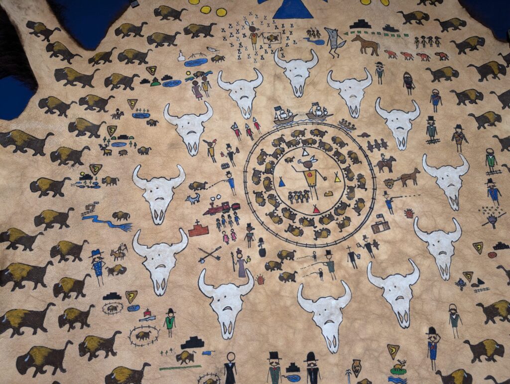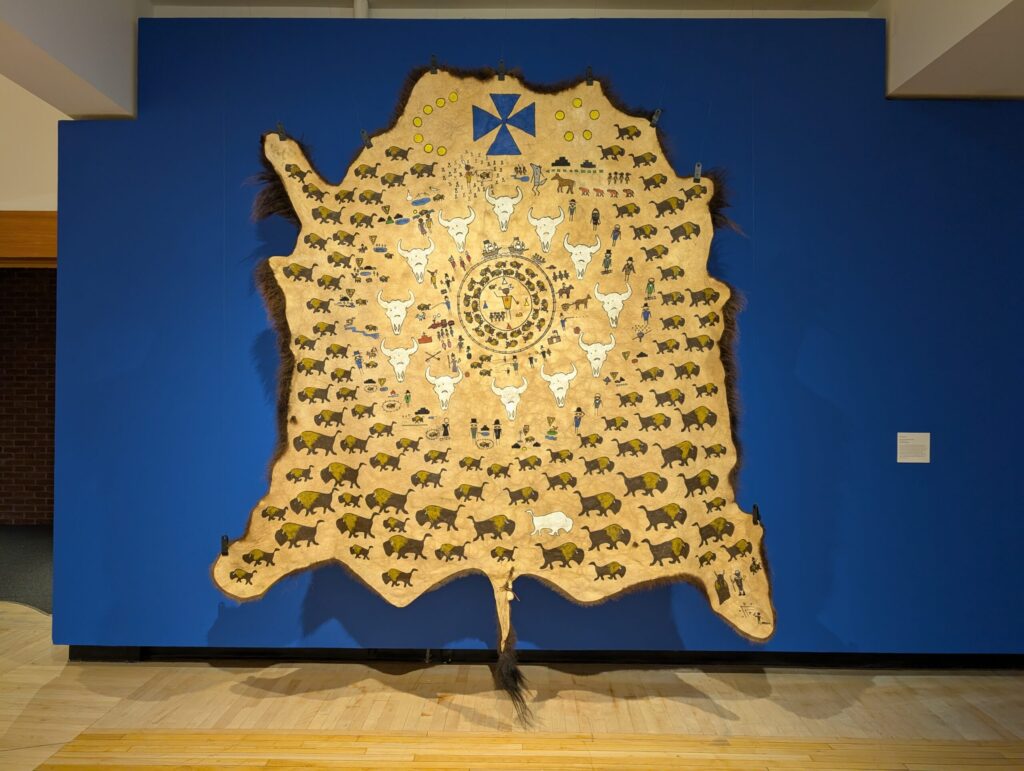 The first piece I chose to reflect on is Bison Survival Story Robe by Adrian Stimson. This work tells the story of the Pablo-Allard herd, which played a crucial role in repopulating the nearly extinct bison species. Stimson depicts this powerful history through a pictograph painting on the robe, highlighting the resilience and survival of the bison. I was moved by this depiction. The bison were once hunted to the brink of extinction, yet a small group managed to survive and ultimately restore their population. Their story is one of strength, endurance, and hope. This piece has inspired me to pay closer attention to stories of resilience especially those connected to the environment. It reminds me that even small efforts can lead to meaningful recovery and change.