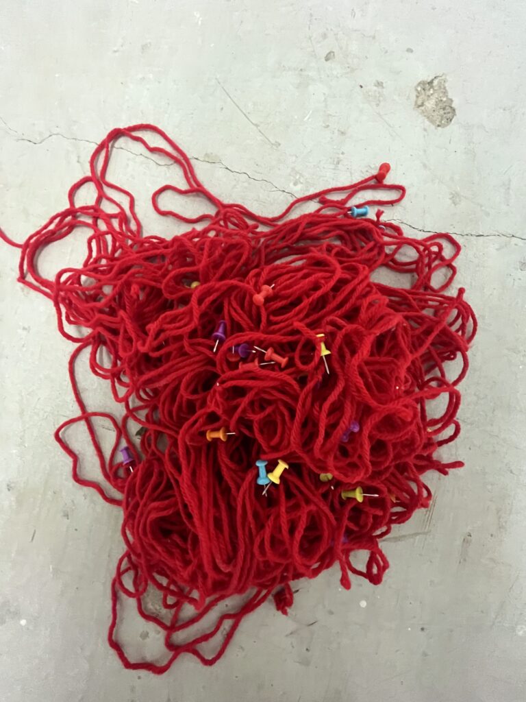 I didn’t follow a plan, everything was guided by intuition. I taped the yarn wherever it felt right, and once the tape was down, I never moved it. I wanted the installation to feel organic and unedited, focusing on abstract shapes and loose ends.