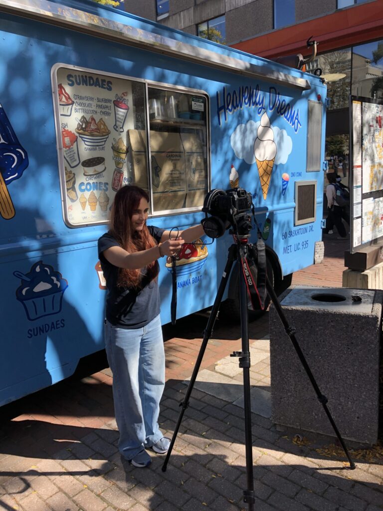 One of the most enjoyable parts of the project was filming in the studio. We had fun experimenting with the camera and finding interesting shots and angles. With Michelle’s guidance, we noticed after importing our footage into DaVinci Resolve that, while the lighting was even and well-executed, the contrast was a bit high. We adjusted the settings in the software, toning it down to improve clarity and crispness.