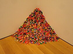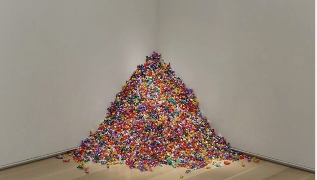 I was inspired by the works of Felix Gonzalez-Torres, whose installations are often minimal and still, yet evoke a profound emotional weight. His piece “Untitled (Portrait of Ross in L.A.)” particularly resonated with me. In it, a pile of individually wrapped candies represents his late husband, Ross, who tragically passed away from AIDS. The pile originally weighed 175 pounds, the healthy weight of Ross’s body, and viewers were invited to take pieces of candy, slowly depleting the pile. This simple but powerful act mirrored the physical deterioration caused by the disease. The work’s quiet simplicity makes its emotional impact all the more profound.